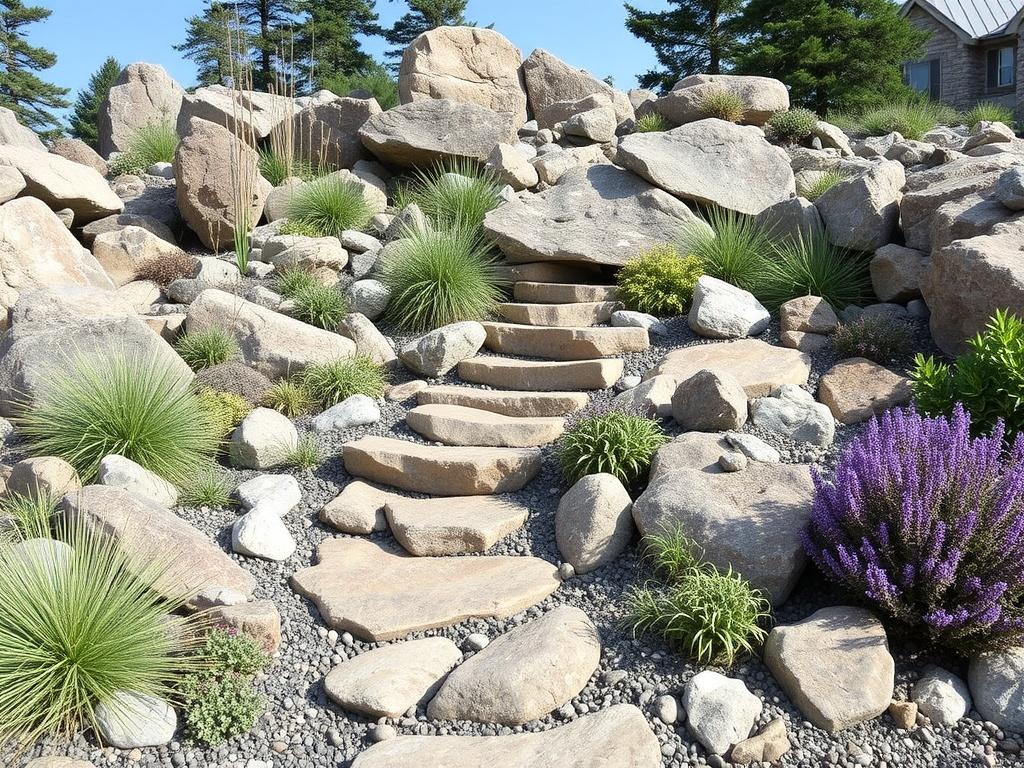 Разумеется, чем больше участок, тем крупнее могут быть камни: от небольших камешков для бордюров до массивных валунов, которые задают фон. В маленьких пространствах выбирают мини-валуны и плиты, чтобы не перегружать композицию и сохранить проходы. Важно ориентироваться по весу: камни должны быть надёжно устойчивыми, особенно в ветреных регионах. Не забывайте про дренаж: при слишком тяжёлых камнях в сочетании с мокрой почвой образуется зонa застоя воды, что неблагоприятно для растений.